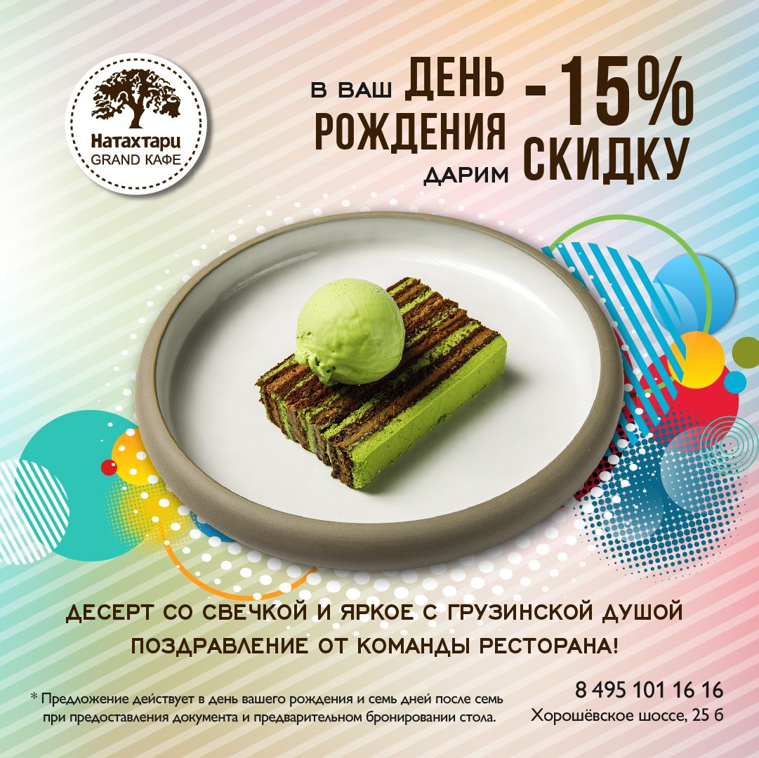 В Ваш самый главный праздник дарим скидку -15% и десерт со свечкой, а также зажигательное поздравление от команды ресторана «Натахтари»